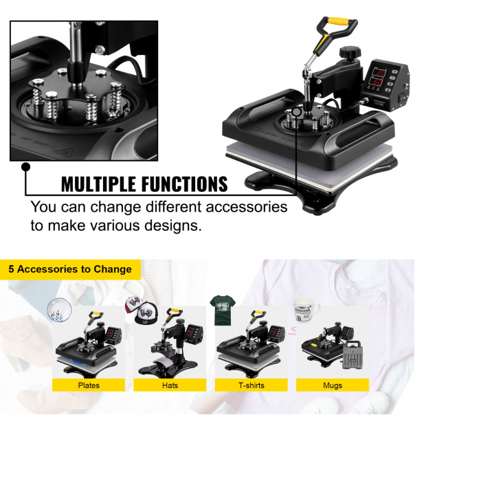 Термопреса Vevor 5 в 1 е професионална машина за сублимационен печат, създадена за всички, които искат да персонализират текстил и сувенири с високо качество. Тя е идеална както за начинаещи, така и за малки бизнеси, които предлагат печат върху тениски, чаши, шапки или други рекламни материали.