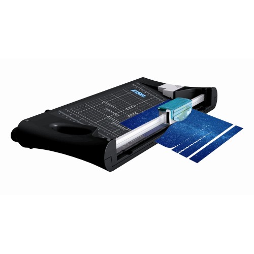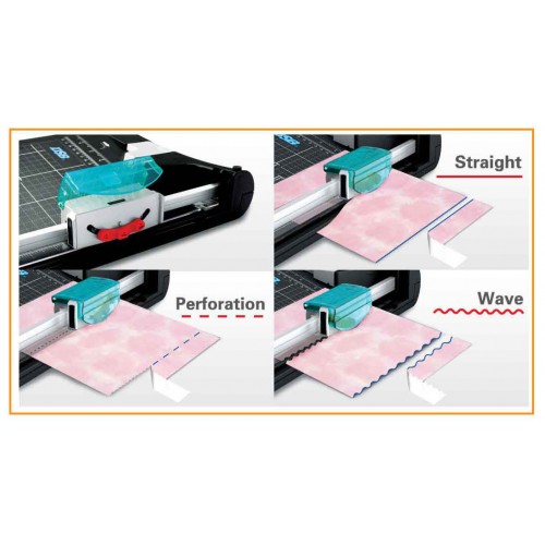 Комбиниран уред - тример и гилотина в едно. Капацитет на гилотината - 10 листа. Тример - право рязане, перфориране, вълнообразно рязане и възможност заобляне на ъгъл