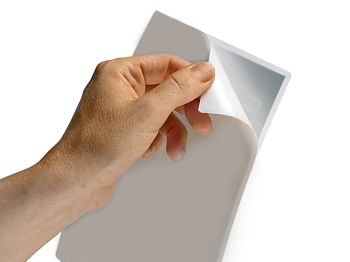 Ламинатно фолио с лепилен слой на гърба позволяващ залепване на ламинираното изделие на всяка повърхност без необходимост от габъри , тиксо, лепило и др. закрепващи материали .