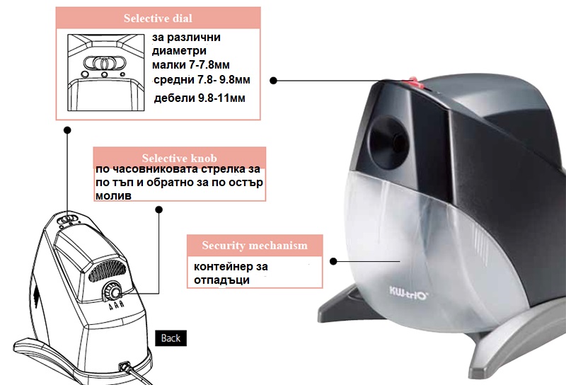 - самоизключване на острилката при неправилно позициониране на молива или при претоварване