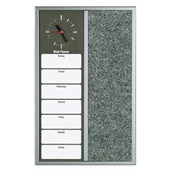 С часовник, дъска за вписване на седмичния план или задачи, с допълнителна текстилна част за съобщения и бележки.