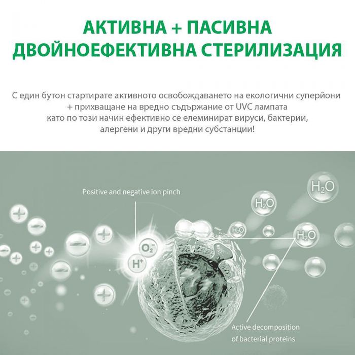 Функцииите екологични суперйони, йонизатор и UV лампа са самостоятелни функции, активират се от отделни бутони от контролния панел и могат да се включват/изключват по Ваше желание!