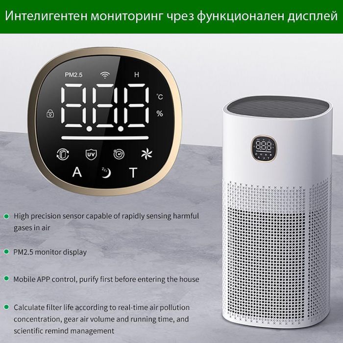 Елегантен и мощен пречиствател на въздух с дисплей, WiFi връзка и 6-степенна пречистваща система - екологични суперйони, 3-слоен 360-градусов филтър, йонизатор, UV лампа