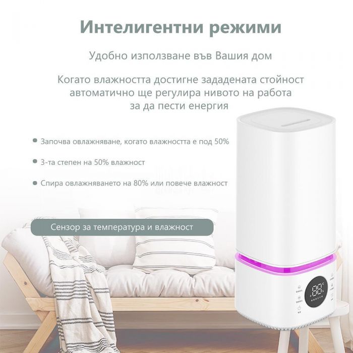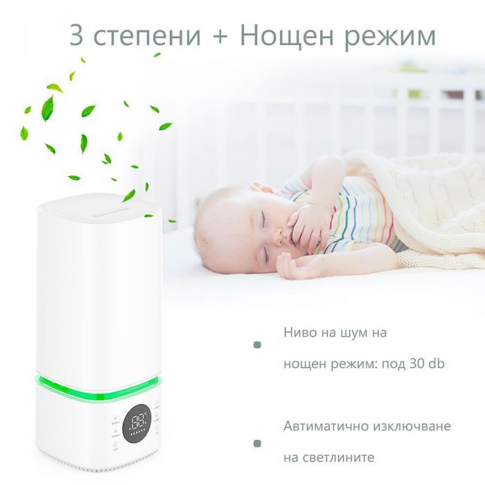 Степени на овлажняване: Интелигентен автоматичен режим, 3 степени на овлажняване, Нощен режим