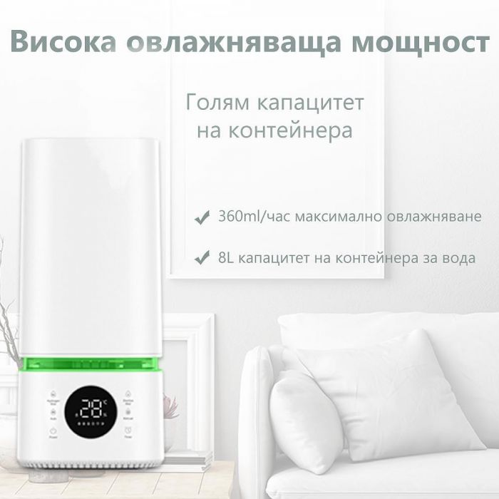 Овлажнителят има модерен дизайн и голям контейнер за вода - 8 литра като можете да избирате дали желаете стандартно овлажняване, генериране на водородна или стерилизационна водна мъгла. Едновременно с това стерилизаторът за въздух BREEZE разполага с HEPA филтър и активен карбонов филтър, който осигурява по-добро качество на въздуха във вашия дом и офис. Уредът за овлажняване BREEZE разполага и с интелигентен автоматичен режим за ултразвуково овлажняване, WiFi връзка, интелигентни сензори за влажност и температура, както и тъч дисплей, на който можете да следите тези стойности, приятно успокояващо осветление и функция за напомняне, ако водата в контейнера е изчерпана.