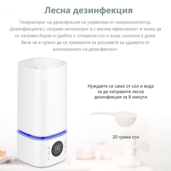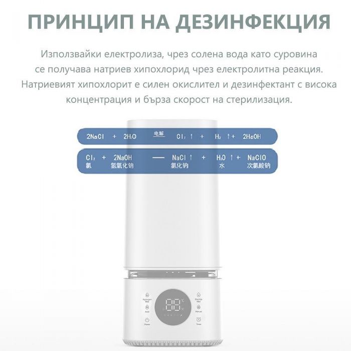 Този режим ви предоставя възможност за дезинфекция с един бутон чрез използване на електролиза на солена вода. По този начин се синтезира Натриев Хипохлорид, който е силен окислител и дезинфектант с бърза скорост на стерилизация. При включването на тази функция не се препоръчва присъствието на хора и животни в помещението. Включете функцията и напуснете помещението, което ще бъде дезинфекцирано за 8 минути и след това проветрете.
