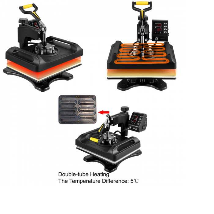 Термопресата е оборудвана с дигитален контролен панел, позволяващ точно регулиране на температурата и времето. Горната плоча се върти на 360°, което улеснява работата и минимизира риска от изгаряния. Уредът гарантира равномерно нагряване и дълготрайни резултати при всеки печат.