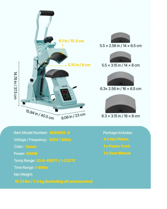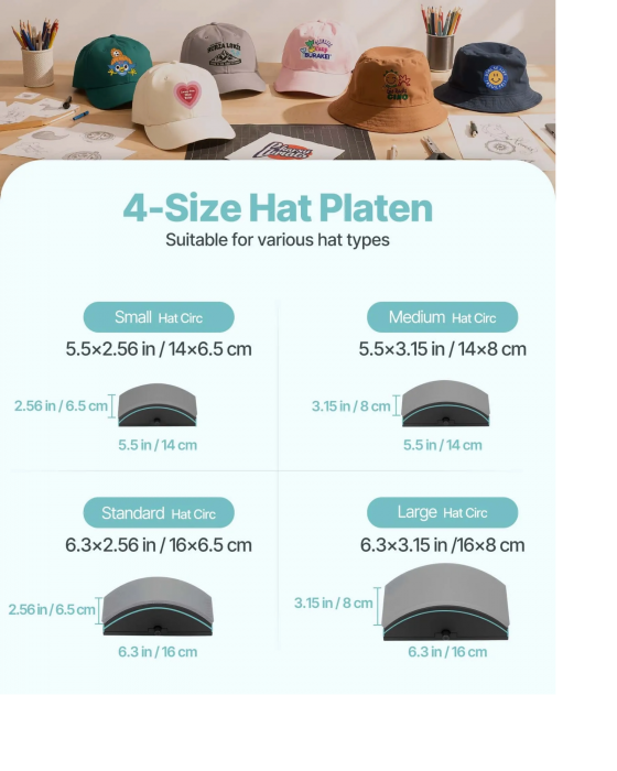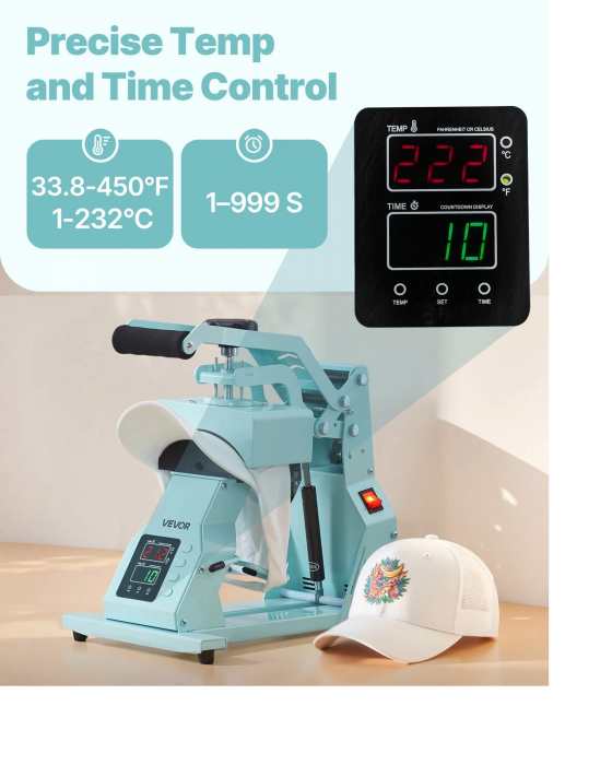 Пресата за шапки осигурява прецизен контрол на температурата (1-232 ℃) и времето (до 999 с) за оптимален печат върху различни материали. Включени са различни нагреватели за шапки за сублимационна хартия, полиестер, памук и др. Идеален е както за начинаещи, така и за професионалисти, осигурявайки лесна употреба.